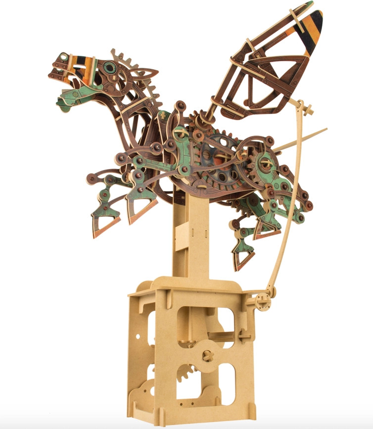 Clockwork Dreams - Pegasus of the Machine Age Whimsical and artistic automata toys designed by master artists, featuring intricate moving parts turned by hand crank. Automata are mini-machines that use cams, gears, ratchets and cranks to make the toy move. Once assembled, turn the crank, and the models come to life! Our wood kits are made from sustainable wood and can be assembled without glue. CNC cut for high precision and quality, these toys are a great joy to put together! Natural wood kits can be painted and decorated as you like. All kits include easy to follow pictorial instructions.