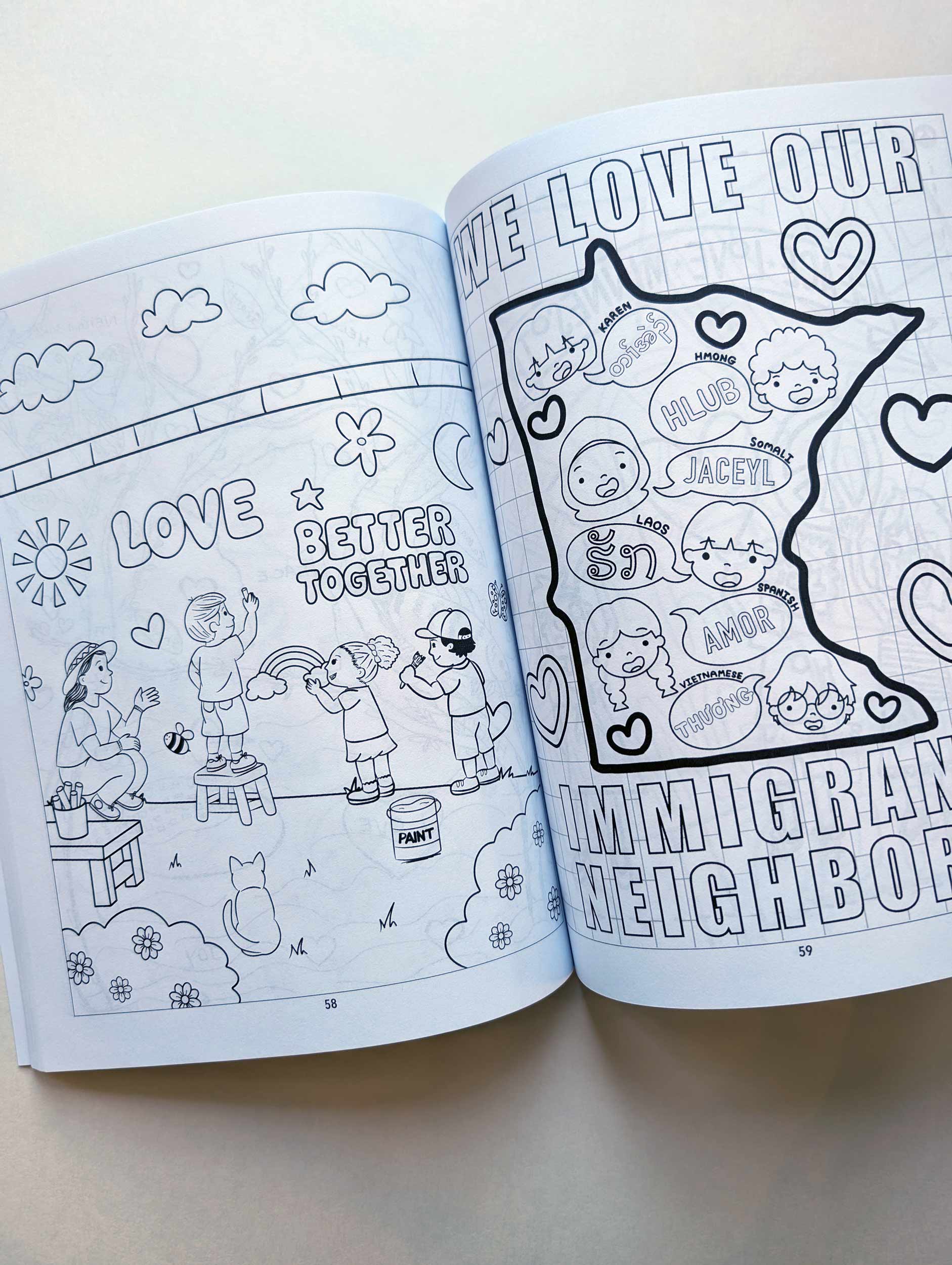 More than 100 local artists and students contributed pages to this coloring book, “Draw Together.” The images range from monarchs to a raccoon with birthday cakes, hearts and “love” written in several languages, and a family of loons with the words “You belong here” floating above.