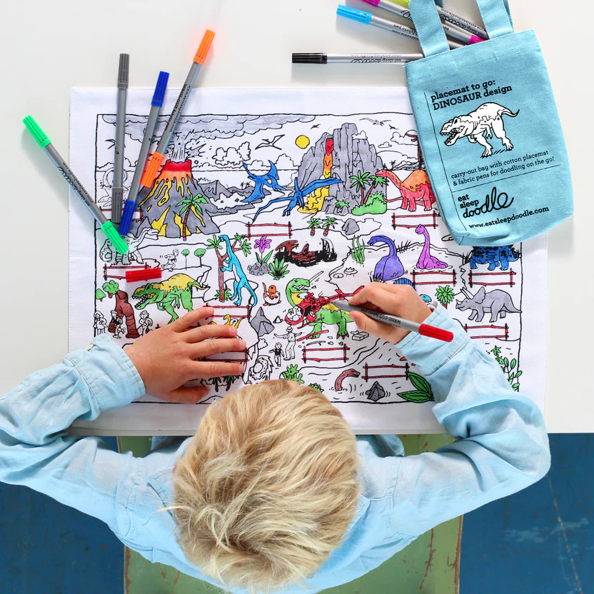 This fun colour-in placemat comes in its own mini tote bag with ten colourful wash-out pens. Kids can learn about the dinosaurs as they colour in this cool placemat featuring our colour-in dinosaur drawing on one side and a notepad print on the other. Whenever they're ready, wash the placemat on a warm machine cycle, the ink completely disappears, and it's ready to be re-coloured and re-discovered - it makes the best gift for dinosaur lovers!