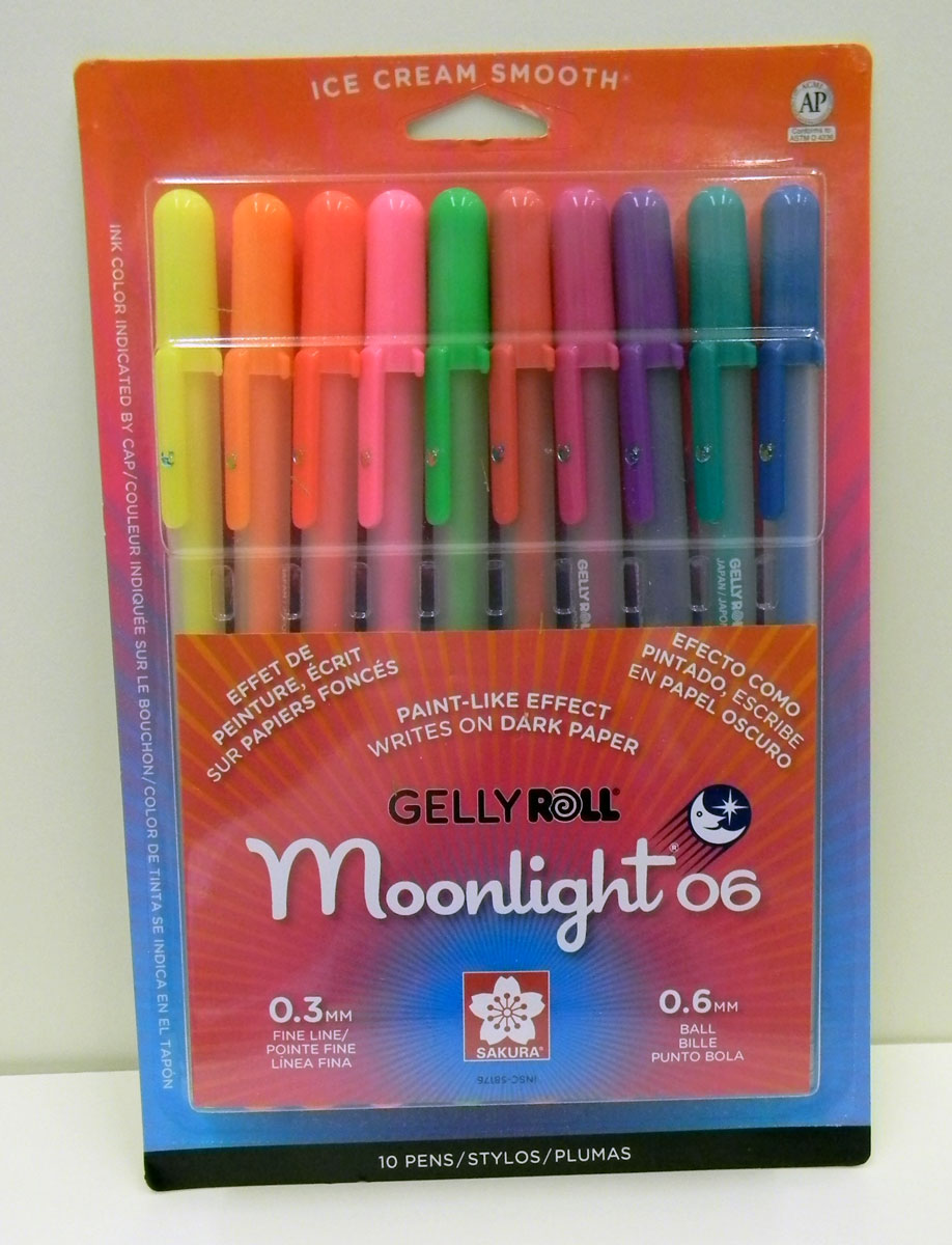 Like the original Moonlight pens, these fine lines will not smear, feather, or bleed-through on most papers and will even write on vellum! They're at their best on black paper (but gorgeous on white paper too) and the fluorescent colors will glow under a black light!