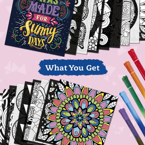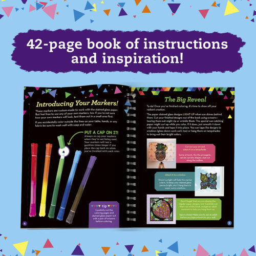 This activity book contains 42-pages of instruction and inspiration, 18 sheets of stained glass coloring paper, and 5 precision-tip markers to create works of art for your windows and walls. Color everything from cats to pineapples to flowers and watch in awe as your artwork catches the light!