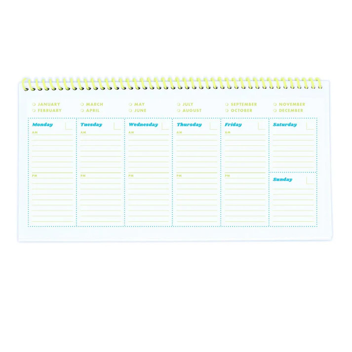 Sized to fit just above your keyboard, this spiral bound undated calendar will last 30 weeks or 6+ months. Going on vacation? Skip a week! Start at any month or date - it never expires! Layout is great for to do lists or short scheduling notes.