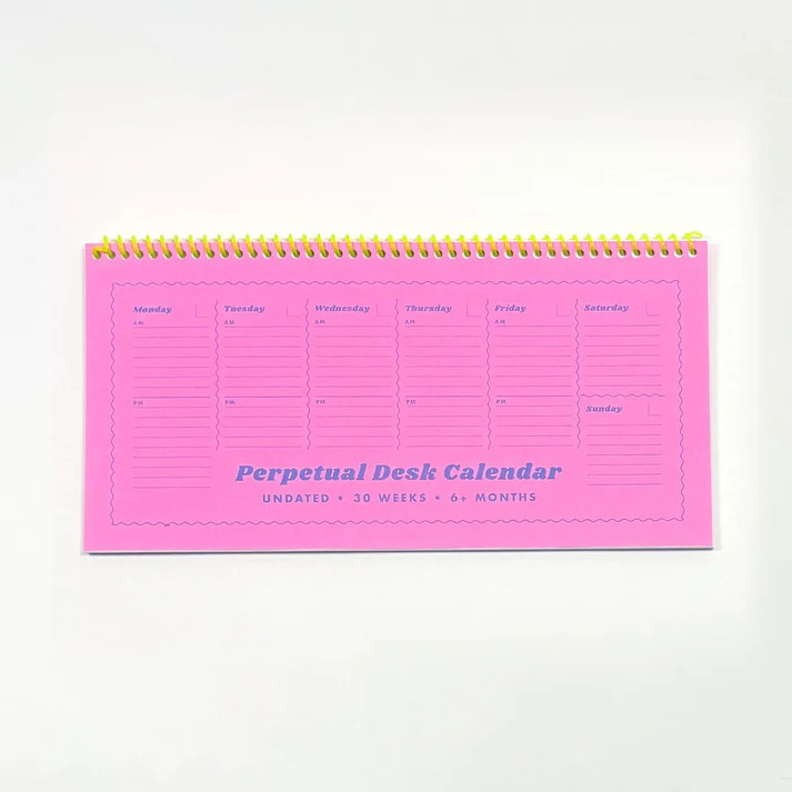 Sized to fit just above your keyboard, this spiral bound undated calendar will last 30 weeks or 6+ months. Going on vacation? Skip a week! Start at any month or date - it never expires! Layout is great for to do lists or short scheduling notes.