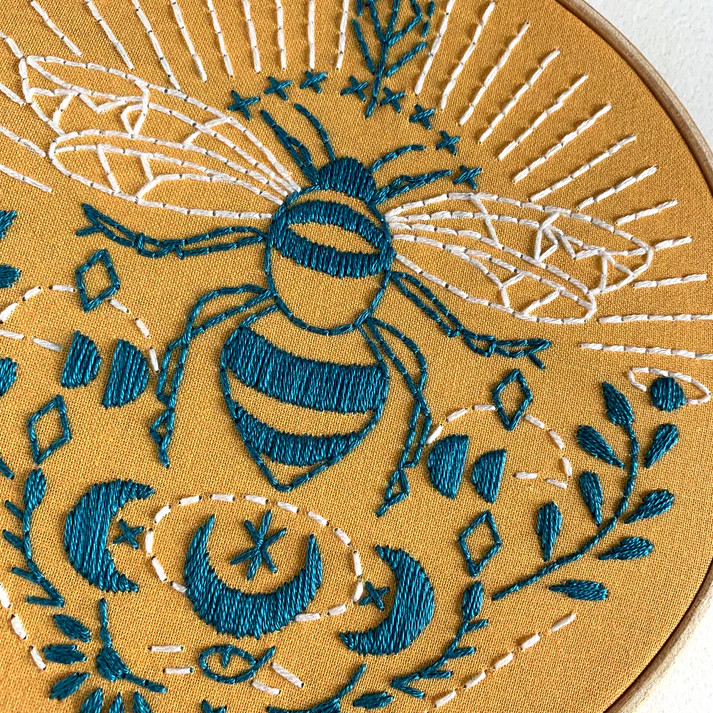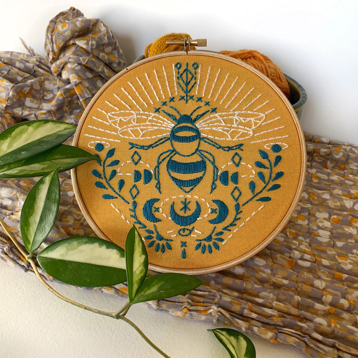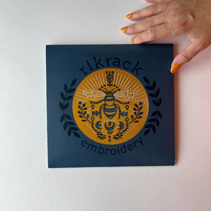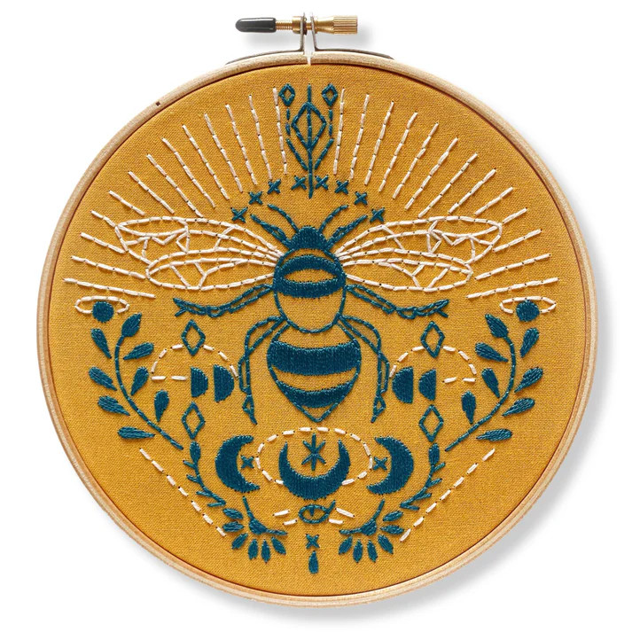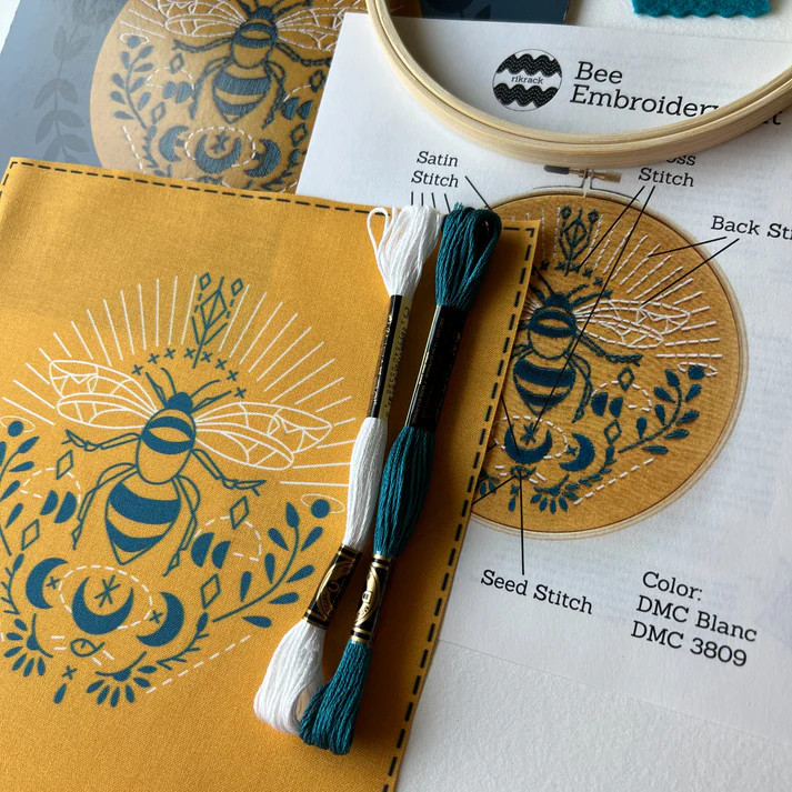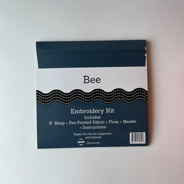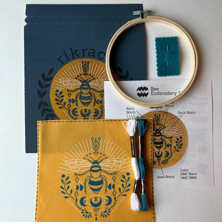 Liven up your next project with the Rikrack Bee Embroidery Kit! With a golden honey background and deep blue and white embroidery floss, it's sure to brighten up your day.
