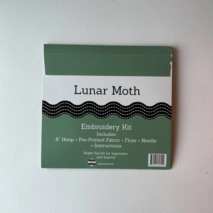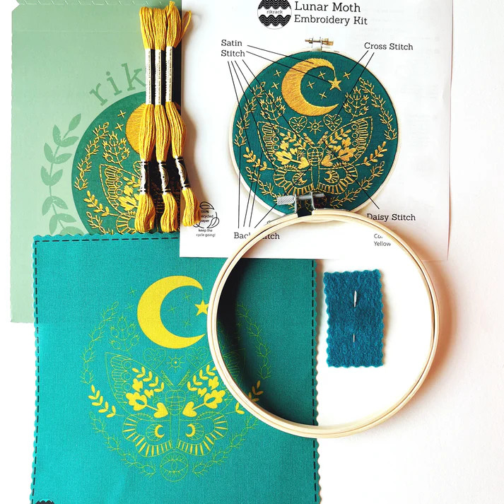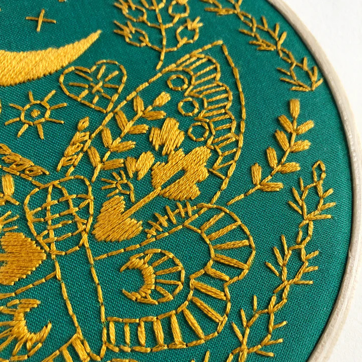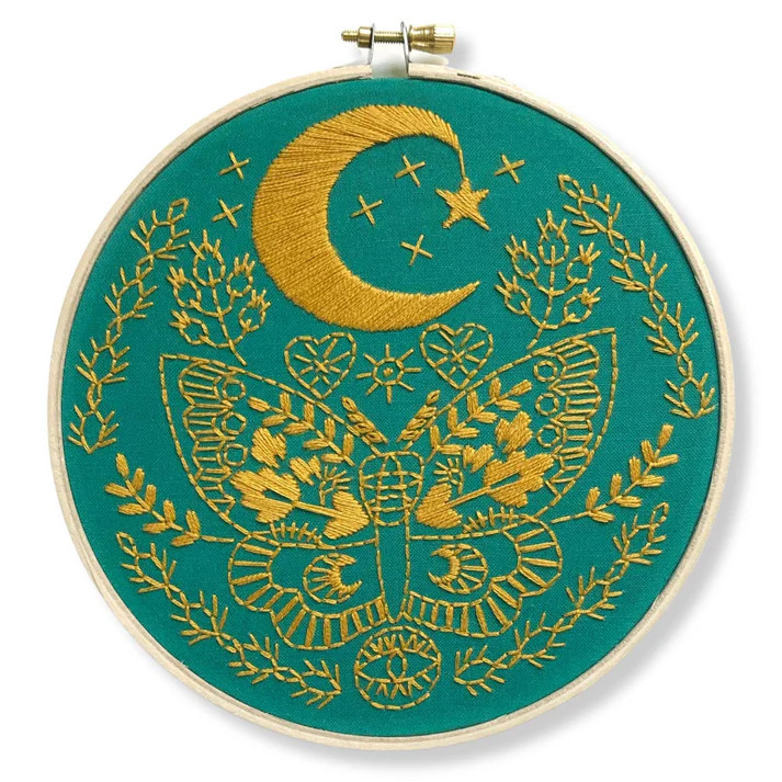 The Lunar Moth embroidery kit features a mystical moon moth design with our signature gold embroidery floss color. It is difficult to show the emerald forest color on a computer monitor but the green and yellow are inspired by antique schoolbook covers.