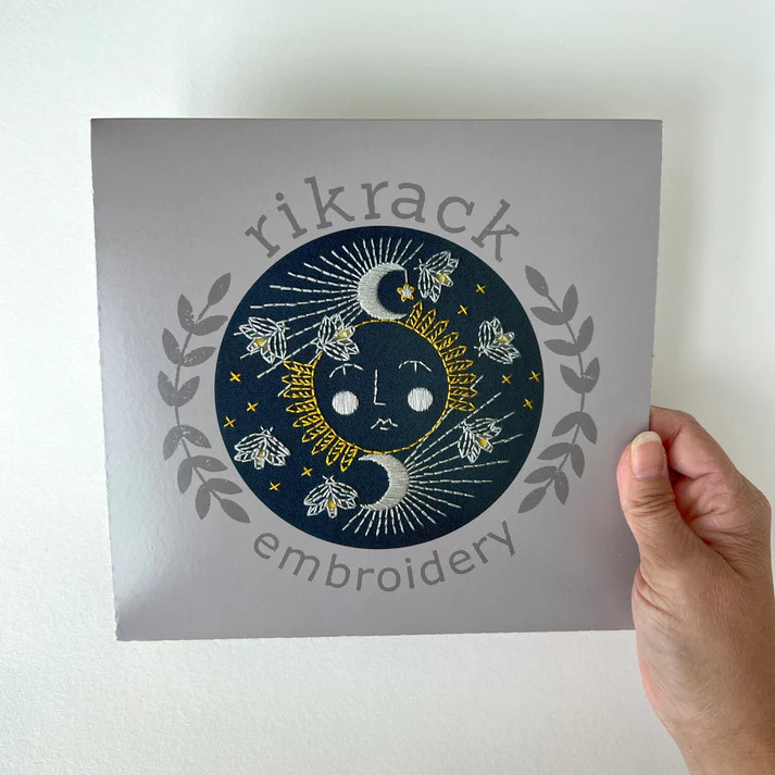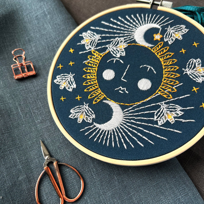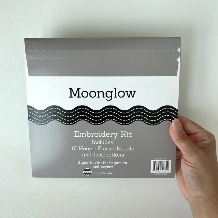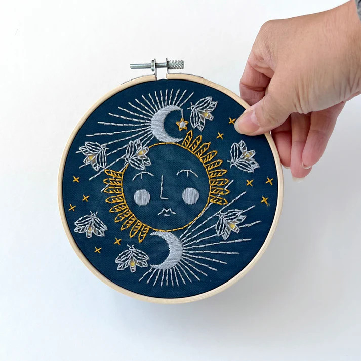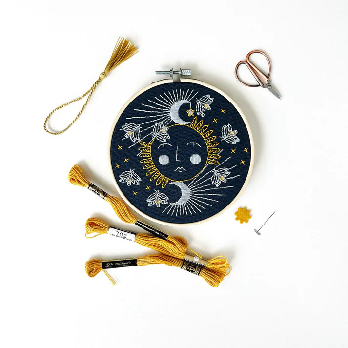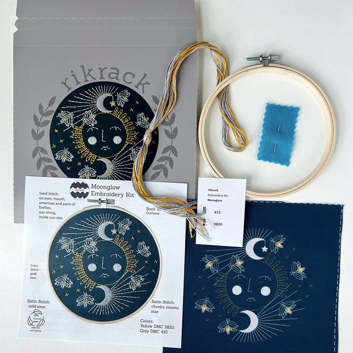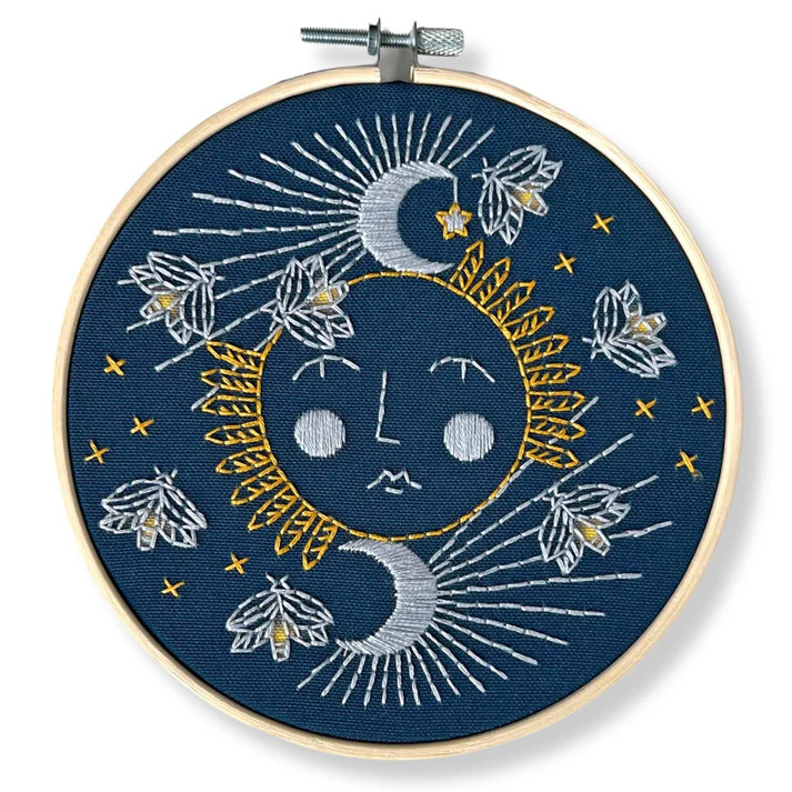 Catch the magic of sunset with our Moonglow Embroidery Kit! Fireflies flutter around the Moonglow and setting sun on a rich navy background.
