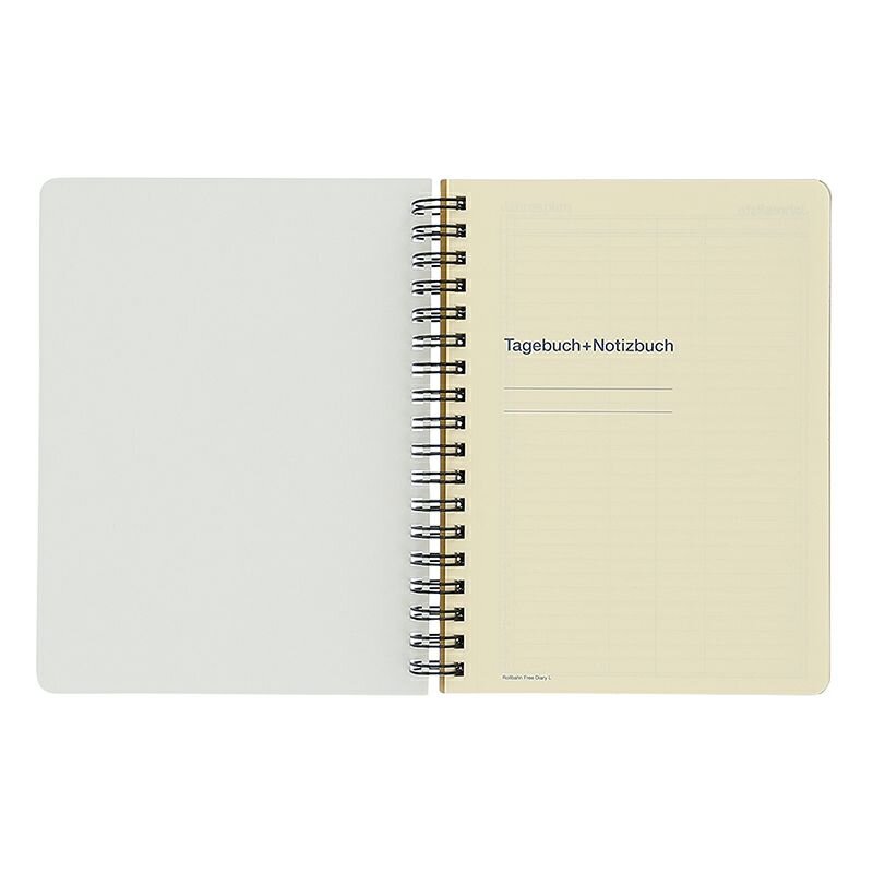 This is a "free" diary with an open dating system. The month and date fields are blank, so you can start using it whenever you like. There are 12 months of monthly pages, 1 year of weekly pages, 72 pages of Rollbahn grid and the usual Rollbahn clear pockets at the back.