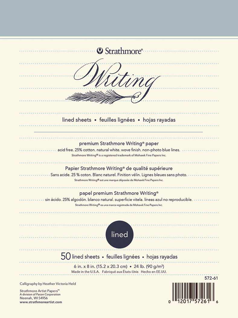 Beautiful 25% cotton writing paper is perfect for calligraphers, hand lettering, and artful correspondence. Available in 2 pad sizes, the natural white, wove finish paper is acid free and is available with non-photo blue lines. Pads feature a flipover cover that allows sheets to remove cleanly from. Perfect for a broad range of ink varieties and writing instruments Acid free.