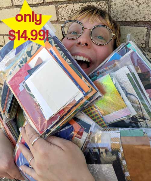 A half pound bag of decorative, printing, drawing, and colored paper scraps that are perfect for collages, card making, and more!