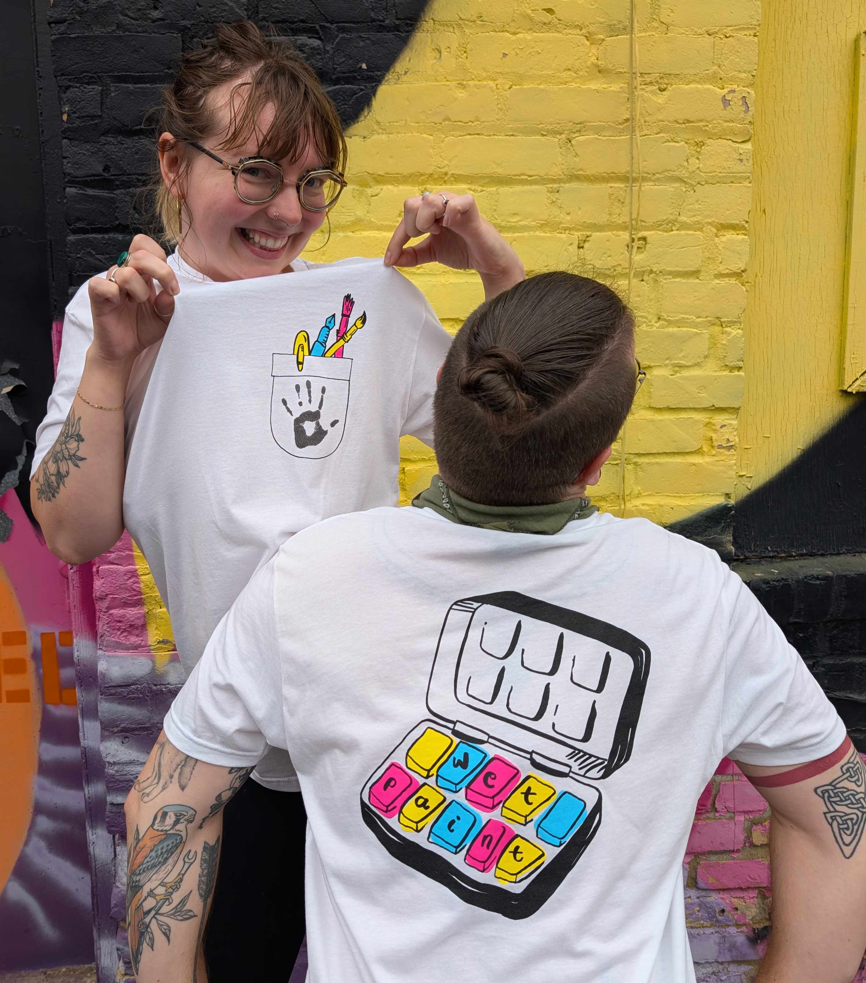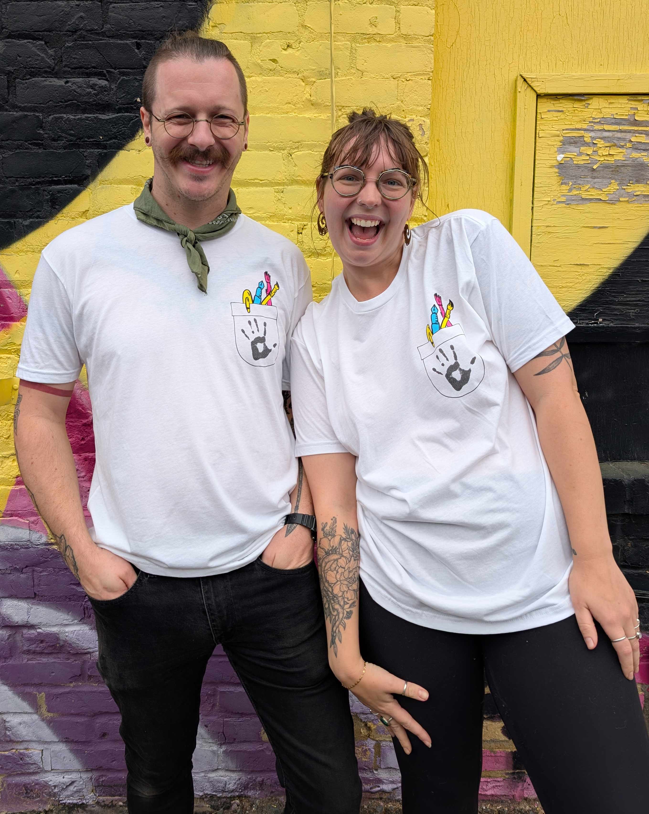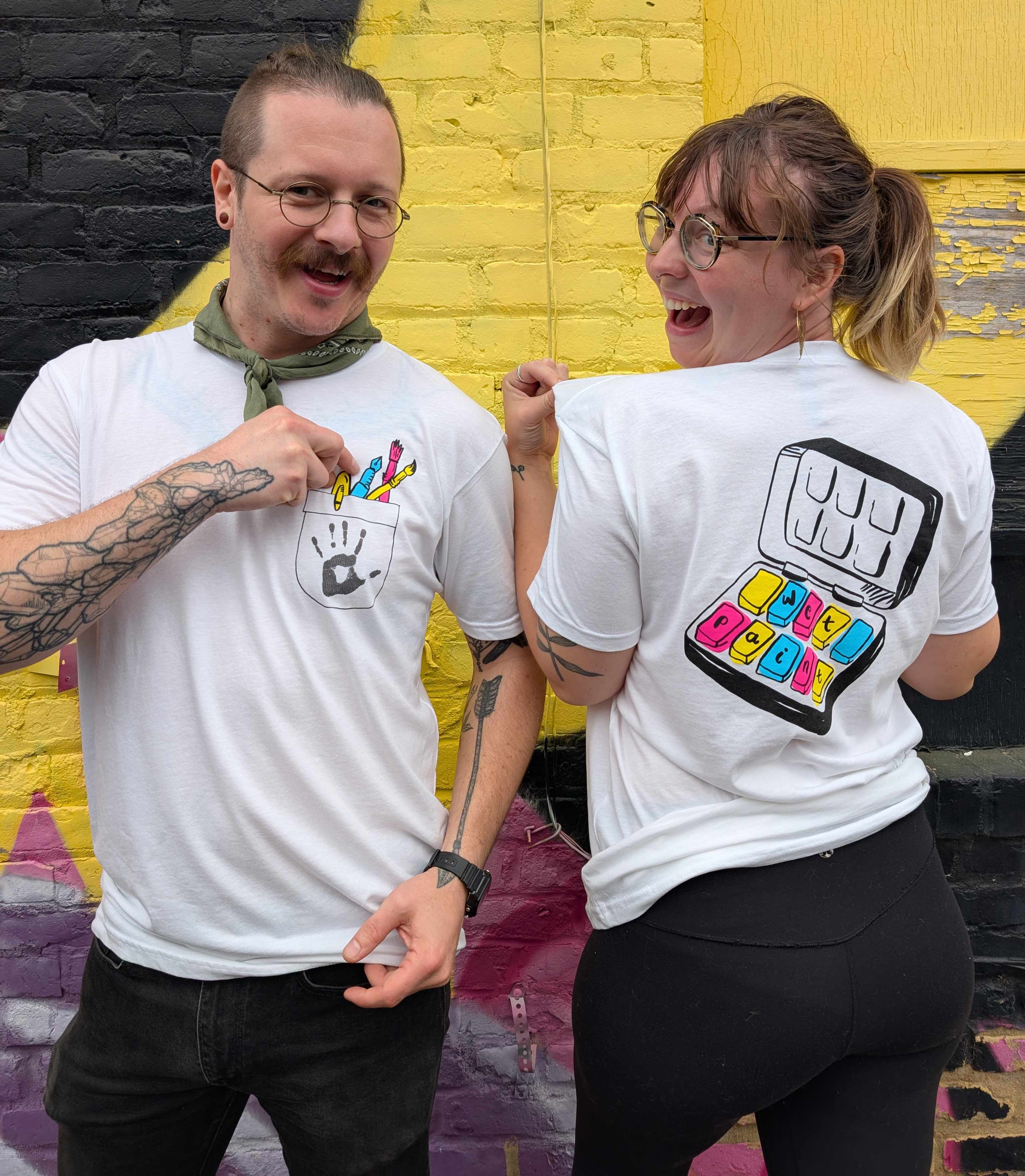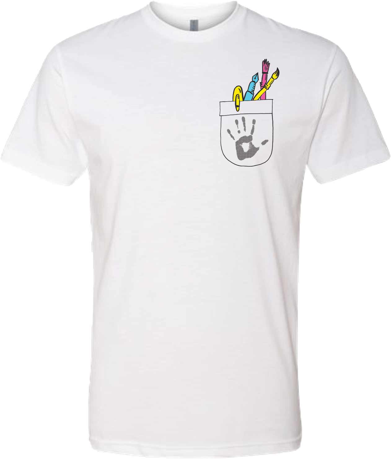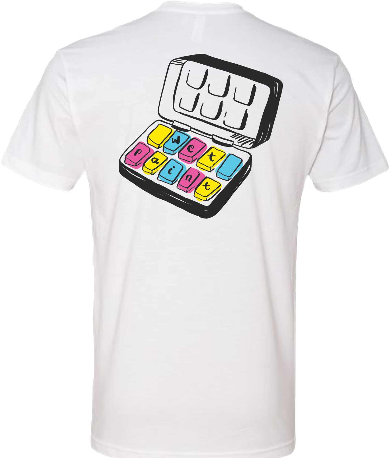 Next Level brand 60/40 combed ring-spun cotton/polyester crew shirt in White with black, pink, blue, and yellow screen print ink on front and back. Features a faux pocket on the front and colorful paint set on the back.